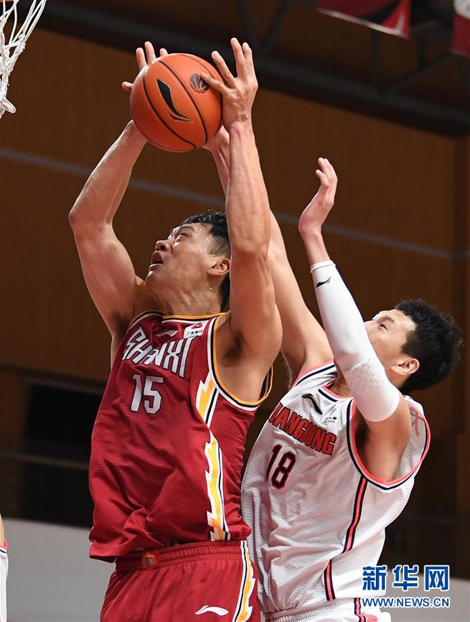 11月5日,山西汾酒股份队球员吴轲(左)与广东东莞大益队球员杜润旺在比赛中拼抢。 当日,在浙江诸暨举行的2020-2021赛季中国男子篮球职业联赛(CBA)第一阶段第九轮比赛中,广东东莞大益队以131比106战胜山西汾酒股份队。 新华社记者 沙达提 摄