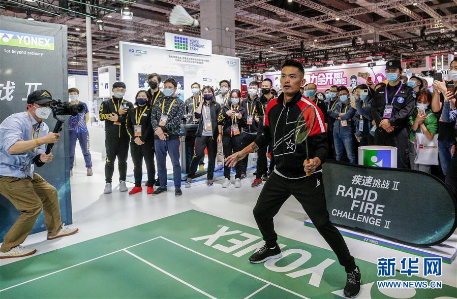 当日,羽毛球奥运冠军林丹现身第三届中国国际进口博览会消费品展区尤尼克斯展台,与现场观众在“疾速挑战”比赛中过招,吸引观众热情围观。 新华社记者 张玉薇 摄