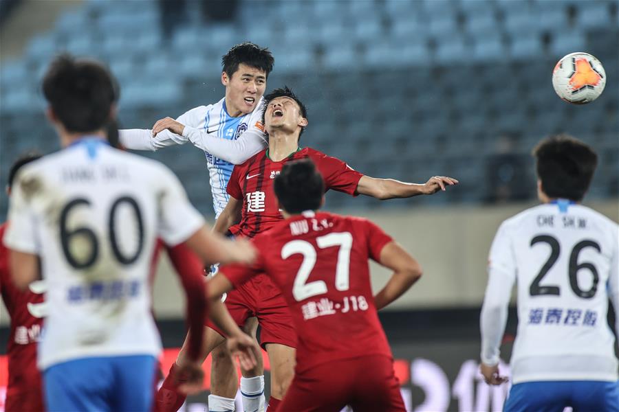 11月10日,天津泰达队球员宋岳(上左)在比赛中头球攻门得分。 当日,在2020赛季中国足球协会超级联赛(大连赛区)第九、十名排位赛次回合比赛中,天津泰达队以1比2不敌河南建业队。最终,天津泰达队以总比分1比2不敌河南建业队,获得本赛季中超第十名。 新华社记者 潘昱龙 摄