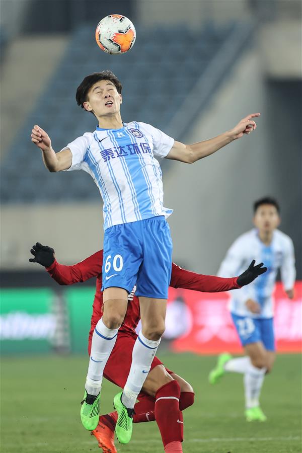 11月10日,天津泰达队球员蒋圣龙(前)在比赛中争抢头球。 当日,在2020赛季中国足球协会超级联赛(大连赛区)第九、十名排位赛次回合比赛中,天津泰达队以1比2不敌河南建业队。最终,天津泰达队以总比分1比2不敌河南建业队,获得本赛季中超第十名。 新华社记者 潘昱龙 摄