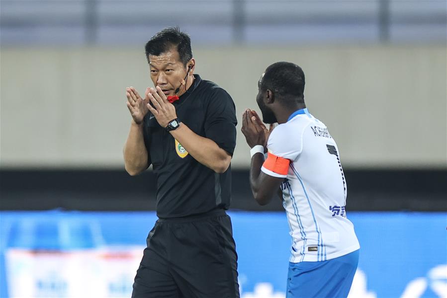 11月10日,天津泰达队球员阿奇姆彭与主裁判王哲(左)在比赛中沟通。 当日,在2020赛季中国足球协会超级联赛(大连赛区)第九、十名排位赛次回合比赛中,天津泰达队以1比2不敌河南建业队。最终,天津泰达队以总比分1比2不敌河南建业队,获得本赛季中超第十名。 新华社记者 潘昱龙 摄