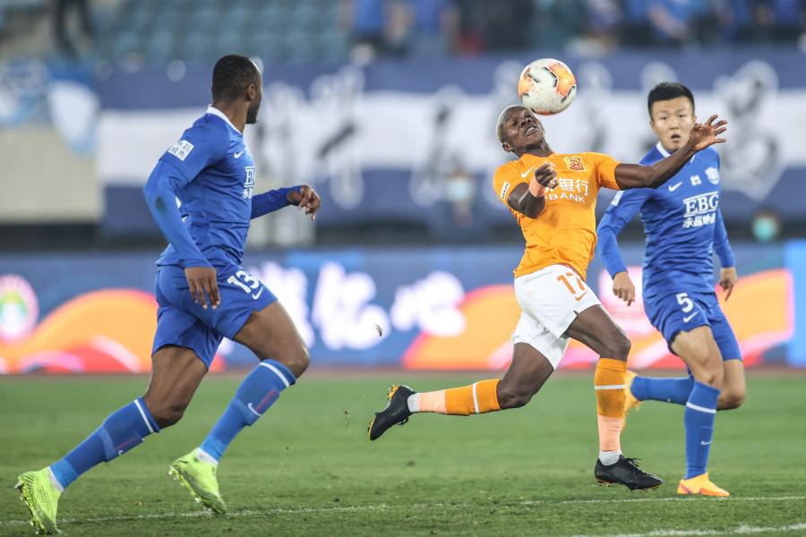 11月11日,武汉卓尔队球员埃弗拉(中)在比赛中停球。