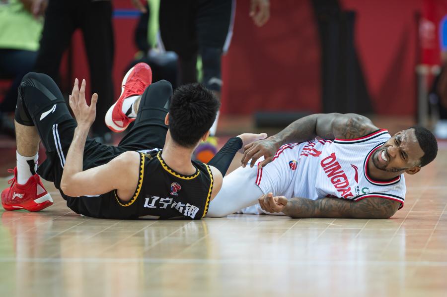 11月13日,辽宁本钢队球员刘志轩(左)在防守中撞倒青岛国信海天队球员亚当斯。