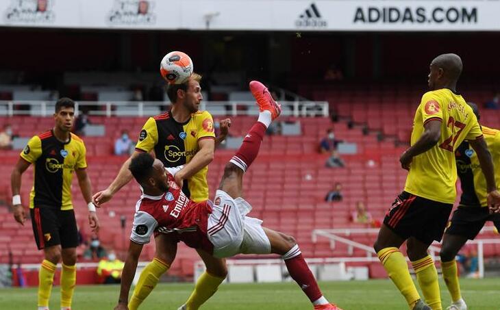 7月26日,沃特福德队球员迪尼(中)在罚进点球后庆祝。 当日,在2019-2020赛季英格兰足球超级联赛第38轮比赛中,阿森纳队主场以3比2战胜沃特福德队。 新华社/路透7月26日,沃特福德队球员维尔贝克(右三)在比赛中射门得分。 当日,在2019-2020赛季英格兰足球超级联赛第38轮比赛中,阿森纳队主场以3比2战胜沃特福德队。 新华社/路透