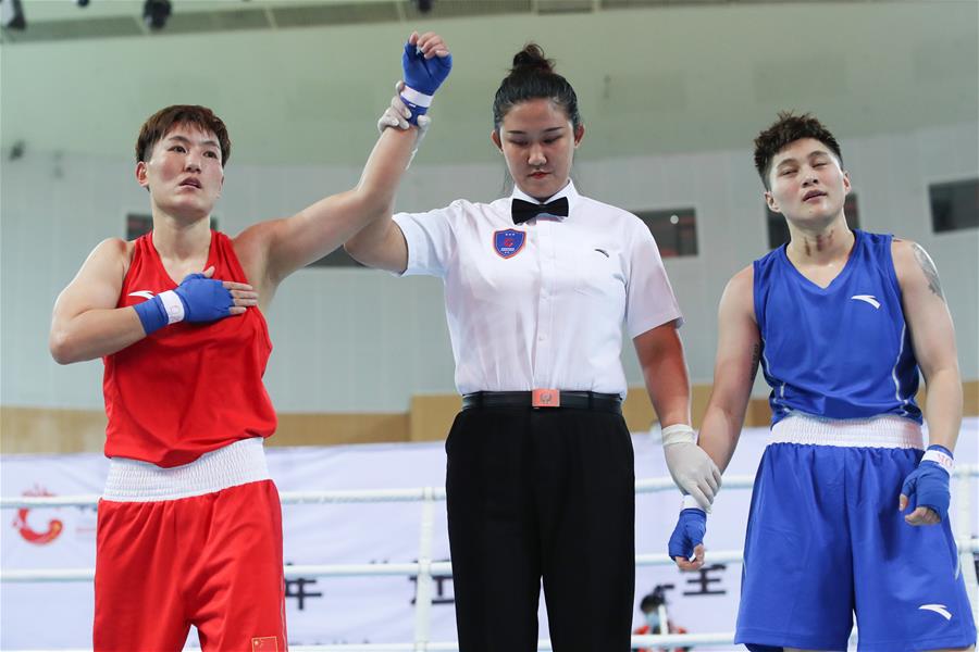 10月20日,裁判判定河北九江队选手尹军花(左)战胜河南队选手阮木兰。 当日,在河北省迁安市唐山九江体育中心进行的2020年“迁安杯”全国女子拳击锦标赛57公斤级四分之一决赛中,河北九江队选手尹军花以5比0战胜河南队选手阮木兰,晋级四强。