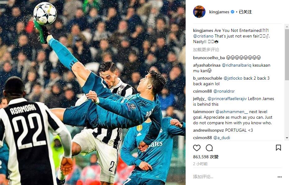 ↑C罗第二个进球为倒挂金钩,瞬间引爆社交媒体。骑士球星勒布朗-詹姆斯也更新Instagram,他写道:“你们不喜欢看这个比赛吗?!@cristiano,这球太不公平,实在太精彩了!” 图片来源:Instagram截图