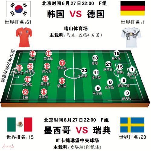 墨西哥队在末轮肯定不会放水,因为一旦输给瑞典队,他们就有可能制造6分出局的笑话。事实上,两队此前曾交手一次,瑞典队以3比0完胜。当然,墨西哥队跟乌拉圭队、克罗地亚队都是本届世界杯的“黑马”,反观瑞典队遭德国队绝杀后士气受挫,可能会急躁。(周婉琪)