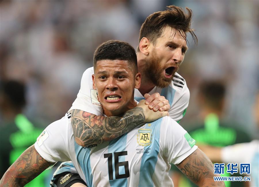 ↑6月26日,阿根廷队球员罗霍(前)进球后与队友梅西庆祝。当日,在圣彼得堡进行的2018俄罗斯世界杯足球赛D组小组赛中,阿根廷队以2比1战胜尼日利亚队,晋级十六强。 新华社记者杨磊摄