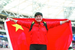 中国选手巩立姣在2018年田径世界杯女子铅球比赛中获得冠军。图为巩立姣获胜后庆祝。 新华社发 (伊莎贝尔·因方特斯摄)