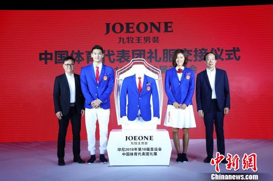 发布仪式上,国家体育总局副局长赵勇与九牧王董事长林聪颖一同揭开第18届亚运会中国体育代表团礼服的神秘面纱。 主办方供图 摄
