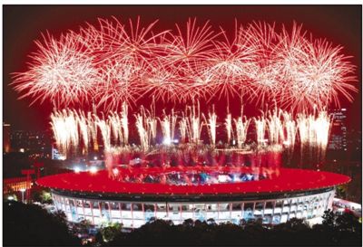 8月18日,第十八届亚运会开幕式在印度尼西亚雅加达举行。图为开幕式上燃放烟花。新华社记者 黄宗治摄