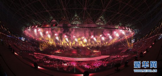 8月18日,第18届亚运会开幕式在印度尼西亚雅加达举行。这是开幕式上燃放烟花(8月18日摄)。新华社记者潘昱龙摄