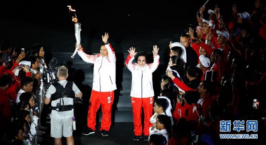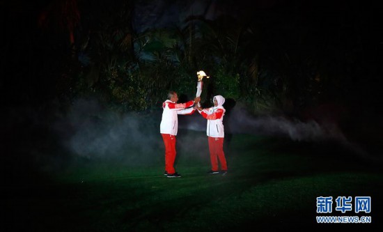 8月18日,火炬手在交接火炬。 当日,第18届亚运会开幕式在印度尼西亚雅加达举行。 新华社记者王丽莉摄