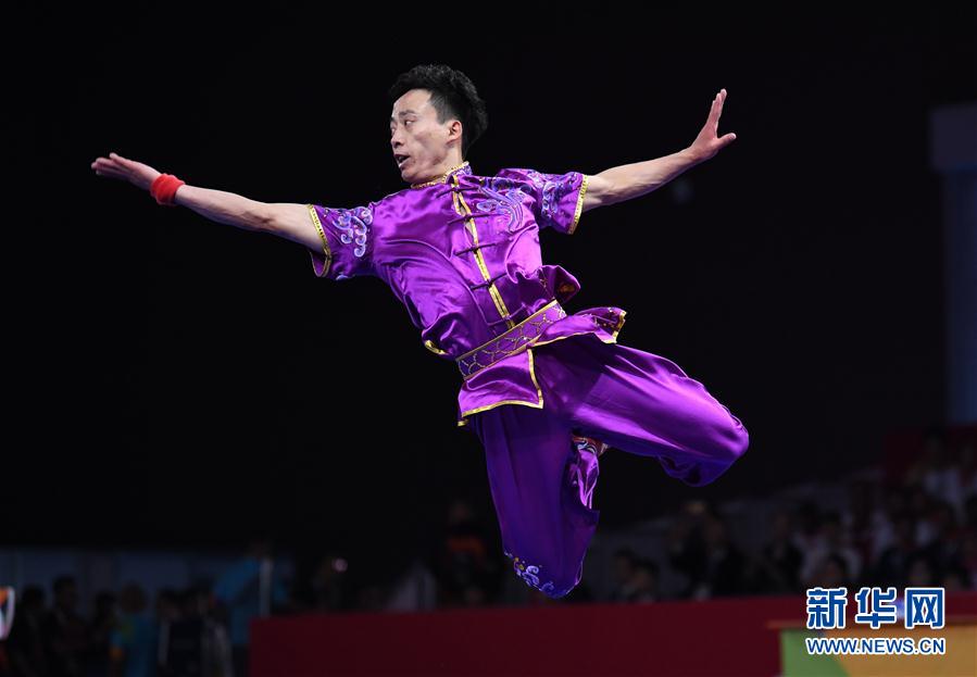 8月19日,中国选手孙培原在比赛中。当日,在第18届亚运会武术男子长拳决赛中,中国选手孙培原以9.75分的成绩获得冠军,本届亚运会首枚金牌产生。新华社记者潘昱龙摄
