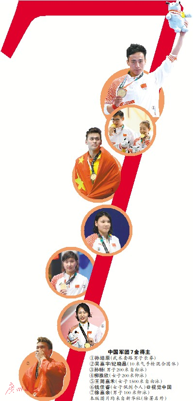 雅加达亚运会开幕后首个比赛日,中国代表团掀起了夺金狂潮,在武术、射击、游泳和击剑4个项目上收获了7金,其中孙培原在武术套路男子长拳项目上为中国代表团夺得本届亚运会首金,游泳名将孙杨、徐嘉余双双收获了个人首枚亚运会金牌。