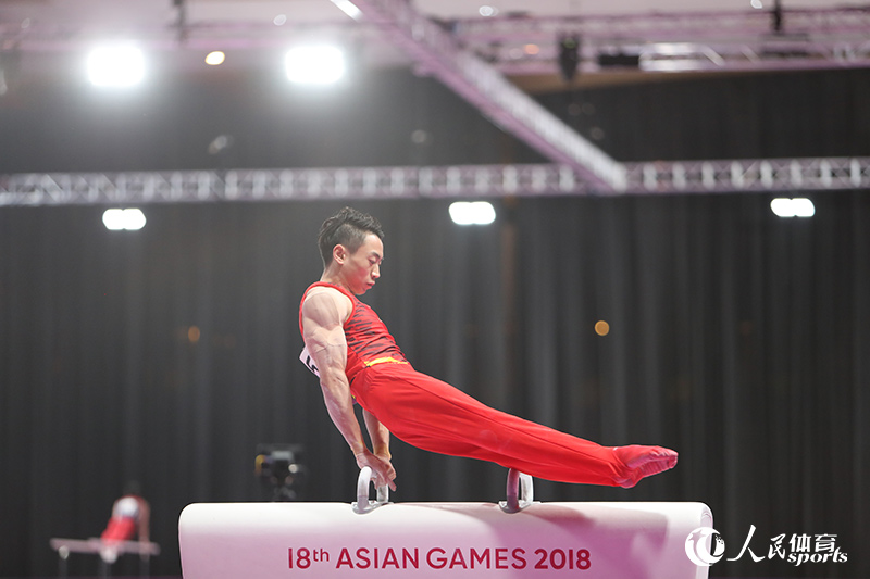 人民网雅加达8月20日电(记者 赵欣悦 摄影报道)当地时间20日下午1点,2018雅加达亚运会体操男子全能比赛开赛,全能比赛同时也是团体和各单项的预赛,意义重大。本次全能比赛共分三个小组进行,中国队被分在第一小组率先出场,中国最大的对手日本队则分在第二个小组。