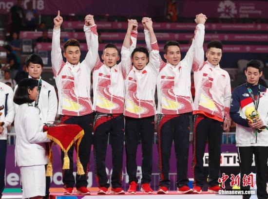 当地时间8月22日进行的雅加达亚运会男子体操团体赛争夺中,以肖若腾、林超攀、邹敬园、邓书弟、孙炜组成的中国队以总成绩260.950分成功战胜日本,收获冠军。四年前的仁川亚运会,中国队男团十连冠被日本队终结。中新社记者 刘关关 摄