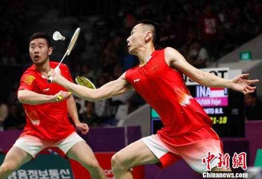中国羽毛球男队于当地时间8月22日晚间3:1战胜东道主印尼,重夺亚运会男团金牌。图为李俊慧/刘雨辰。 杜洋 摄