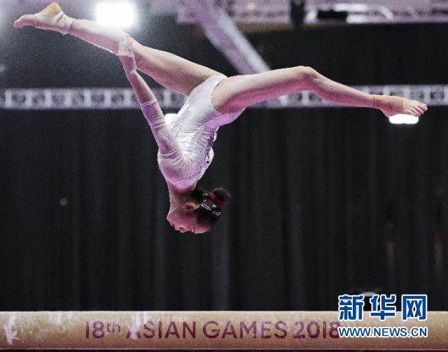 ↑中国队刘婷婷在比赛中。在亚运会体操女子团体决赛中,中国队以165.250分的总成绩获得冠军。新华社记者朱炜摄