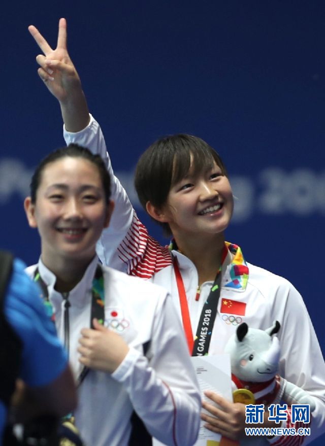 ↑李冰洁(右)在颁奖仪式后。在亚运会女子200米自由泳决赛中,她以1分56秒74的成绩夺冠。新华社记者费茂华摄