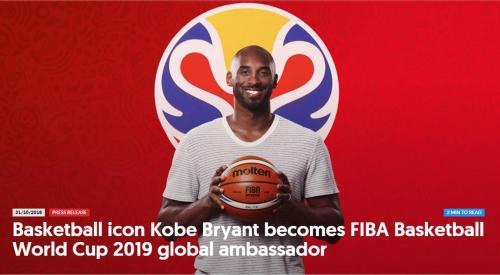 科比将携手姚明成为世界最高级别篮球赛事——2019年国际篮联篮球世界杯的全球大使。作为全球大使,科比将帮助宣传、推广2019年国际篮联篮球世界杯,并参与相关一系列活动。