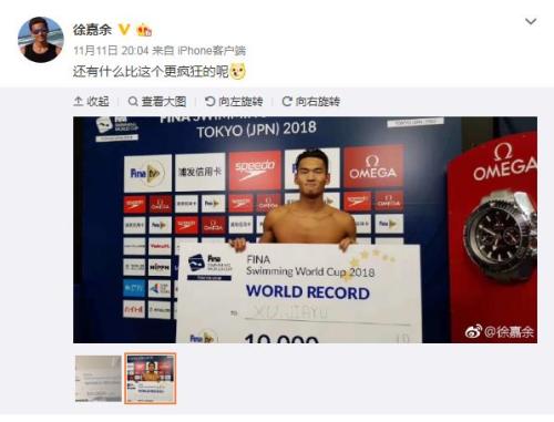 虽然强敌环伺,但在打破世界纪录后,徐嘉余言语间对未来充满自信。他还在微博上传了刷新纪录的认证照,用他的话说,“还有什么比这个更疯狂的呢?”