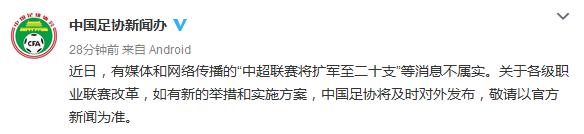 中新网11月13日电 中国足协新闻办今日在官方微博发布消息称,近日,有媒体和网络传播的“中超联赛将扩军至二十支”等消息不属实。关于各级职业联赛改革,如有新的举措和实施方案,中国足协将及时对外发布,请以官方新闻为准。