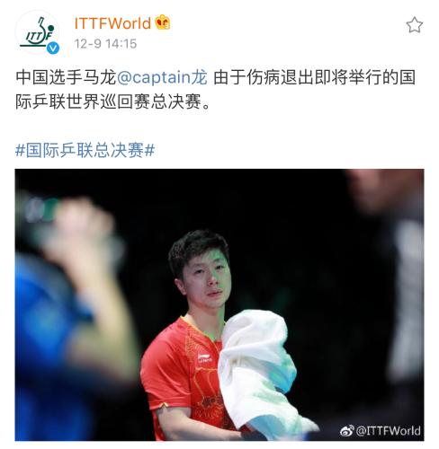 中新网客户端12月9日电 (王禹)北京时间12月9日下午,国际乒联官方宣布,国乒队长马龙由于伤病退出即将举行的国际乒联世界巡回赛总决赛。此前,马龙曾因膝盖伤势连续退出奥地利公开赛和瑞典公开赛,祝福龙队早日康复。
