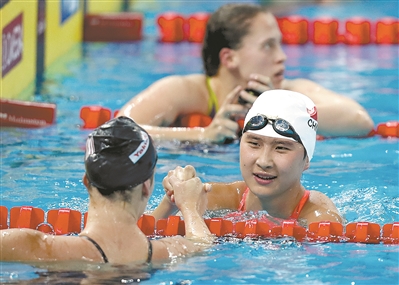 在女子800米自由泳决赛中,王简嘉禾以绝对优势夺冠,但8分04.35秒的成绩她认为并不理想,原来她与教练都希望努力冲击世界纪录的,可能正因为这样,她有点着急了,经验不足的她并没有掌握好节奏,体能分配不合理,前程游得太快,后劲不足。不过,王简嘉禾表示,接下来还有400米的比赛,还是希望再突破一下自己。