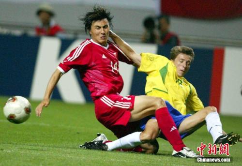 2002年韩日世界杯,中国男足历史上首次闯入世界杯决赛圈,6月8日,中国队在韩国西归浦世界杯体育场与世界劲旅巴西队对阵。中新社记者 毛建军 摄