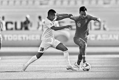 中国队18号郜林(右)突破吉尔吉斯斯坦队防线。京报体育全媒体特派记者 刘平摄