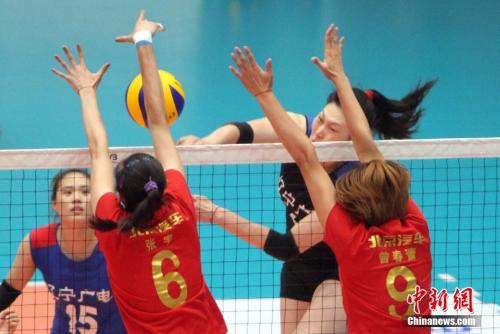 资料图:北汽女排队员拦网。中新社记者 张道正 摄