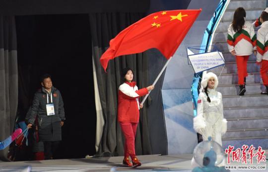 当地时间3月2日晚,第29届世界大冬会开幕式,北大学生杨诗琦担任中国代表团旗手。中国青年报·中青在线特派记者 慈鑫/摄