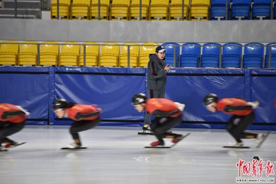 当地时间2月27日,中国短道名将王濛在指挥中国大学生短道队训练。中国青年报·中青在线特派记者 慈鑫/摄