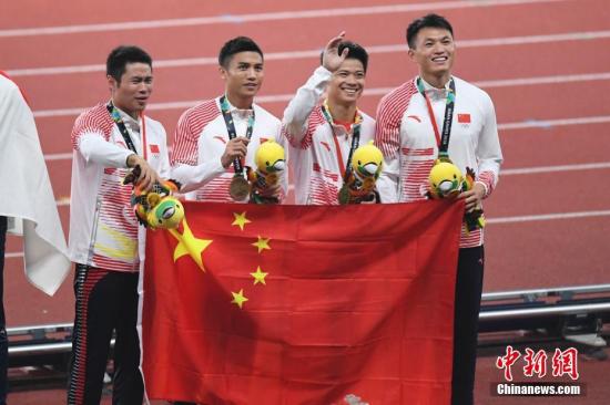 资料图:雅加达亚运会上,中国代表团在田径项目获得12枚金牌,与巴林队持平。图为中国队选手登上领奖台向观众招手致意。中新社记者 杨华峰 摄