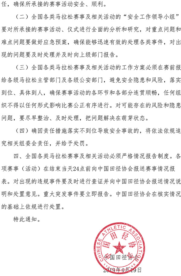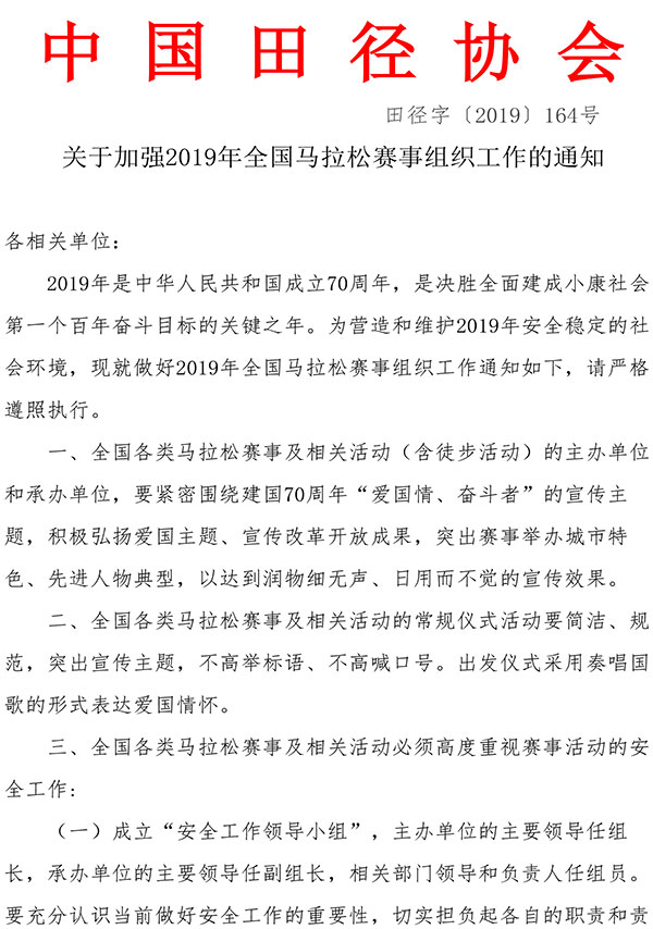 中新网4月26日电 25日,中国田径协会官方网站发布了关于加强2019年全国马拉松赛事组织工作的通知,要求马拉松赛事及相关活动的常规仪式要简洁、规范,不高举标语、不高喊口号。