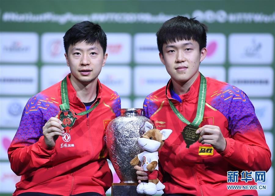 4月27日,马龙(左)/王楚钦在颁奖仪式上。 当日,在匈牙利布达佩斯进行的2019世界乒乓球锦标赛男子双打决赛中,中国选手马龙/王楚钦以4比1战胜跨国组合约内斯库(罗马尼亚)/罗布勒斯(西班牙),夺得冠军。 新华社记者逯阳摄