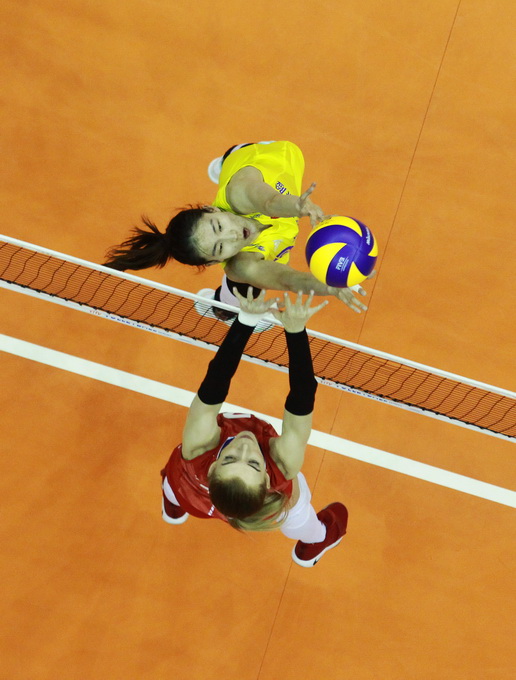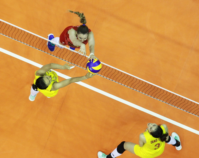 中国队副攻线经受了考验,网口争夺并不落下风,中国队以14比11领先。可惜的是,中国队自身进攻和一传出现问题,给了俄罗斯队以17比15逆转的机会。中国队奋力追成17平,无奈自身进攻得分受阻,俄罗斯队再度领先,随后安家杰用段放换下杜清清,虽然刁琳宇的拦网和曾春蕾的后攻连扳两分,但是随着尤林斯卡娅的强攻,俄罗斯队仍以25比22先胜一局。第二局中国队由胡铭媛和王媛媛搭档副攻线,段放和刘晏含联袂主攻线。段放、曾春蕾和胡铭媛定点拦网成功,打出威力的中国女排以25比16扳回一局。