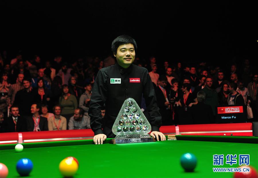 2011年1月16日,在伦敦温布利体育馆进行的2011年斯诺克大师赛决赛中,中国选手丁俊晖以10比4击败中国香港选手傅家俊,首度获得斯诺克大师赛冠军。图为丁俊晖在颁奖仪式上。 新华社记者曾毅摄