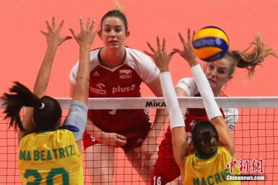 7月4日下午,2019世界女排联赛总决赛继续在南京进行,在B组的较量中,巴西女排(黄衣)3比2战胜波兰女排(红衣)。中新社记者 泱波 摄