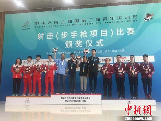 江苏省苏州市体育运动学校盛李豪、诸葛超然、董俊渡三人团体斩获本届射击(步手枪项目)比赛的首枚金牌。 杨静 摄