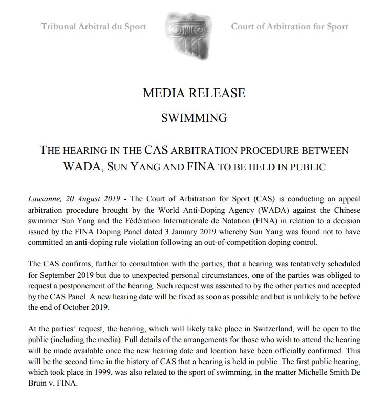 孙杨的律师团队随即发表声明表示,反对个别外媒对其进行“审判”,并在互联网上煽动第三方对其产生负面和诽谤反应。同时,要求国际体育仲裁法庭(CAS)举行听证会的时候,向公众开放,以求公开透明,证明自己的清白。