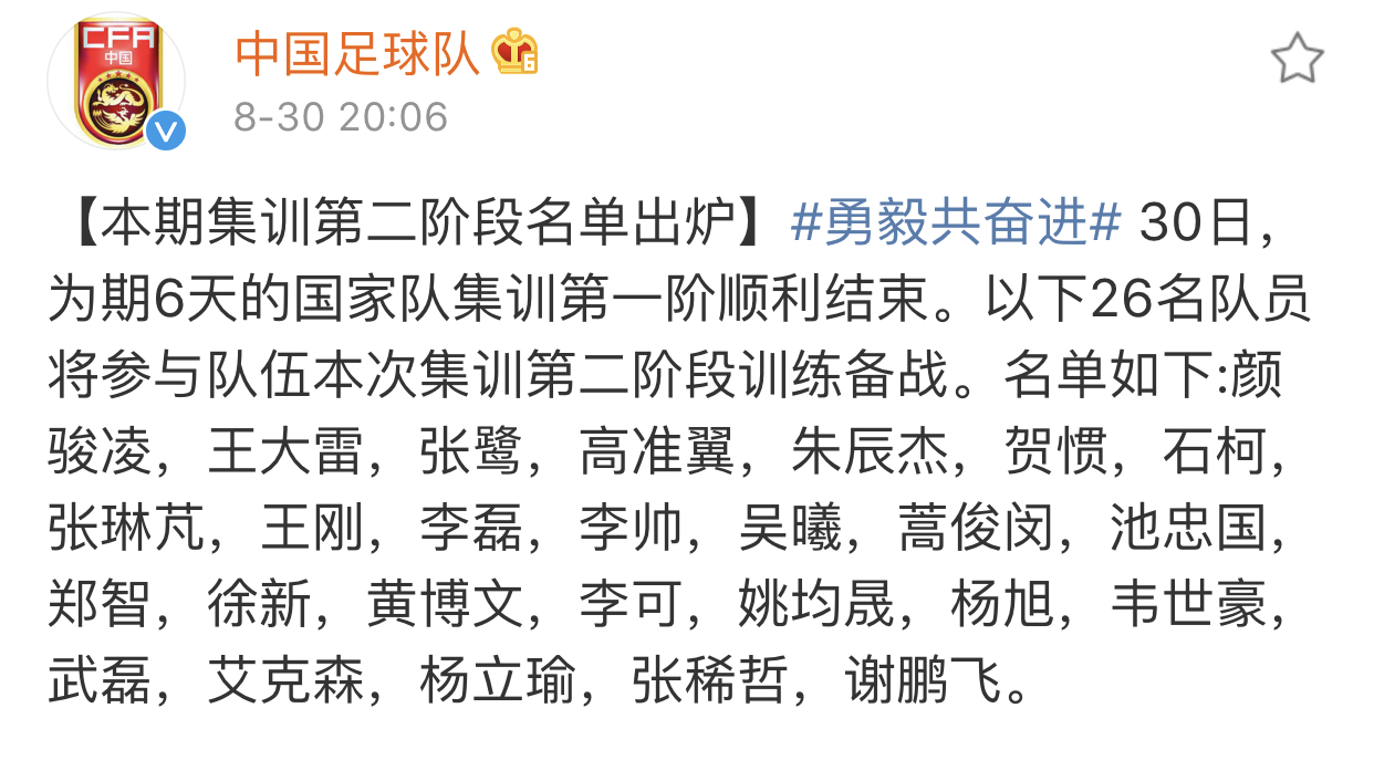 国足集训第二阶段名单。图片来源:中国足球队官方微博