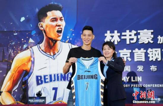 9月26日,林书豪抵达北京,并携首钢男篮7号球衣与媒体见面。图为北京首钢篮球俱乐部董事长秦晓雯(右)为林书豪送上7号球衣。中新社记者 张兴龙 摄