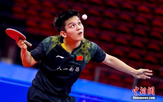 资料图:10月21日晚,第七届世界军人运动会乒乓球男子团体决赛在湖北省武汉市举行,中国队以3比1战胜朝鲜队获得乒乓球男子团体冠军。图为中国队樊振东在比赛中。中新社记者 张畅 摄