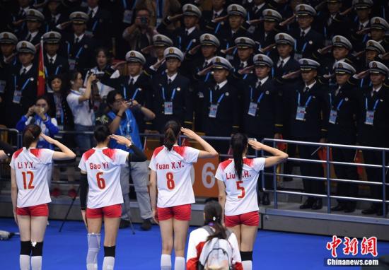 10月22日,中国八一女排在决赛中以1:3不敌巴西,获得该项目亚军。赛后,队员们在场边列队,向看台上的“观众”敬礼。中新社记者 侯宇 摄