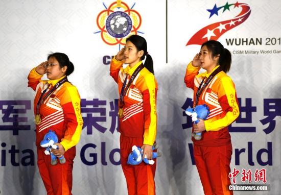 10月24日,在湖北省武汉市进行的第七届世界军人运动会女子25米手枪军事速射团体比赛中,经过6轮比拼,中国队以1738.59环获得冠军。图为颁奖仪式现场。中新社记者 周毅 摄