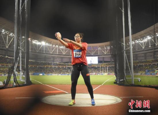 10月24日晚,第七届世界军人运动会女子铁饼决赛在湖北省武汉市举行,中国选手冯彬以64米83夺得冠军。图为冯彬在比赛中。中新社记者 侯宇 摄