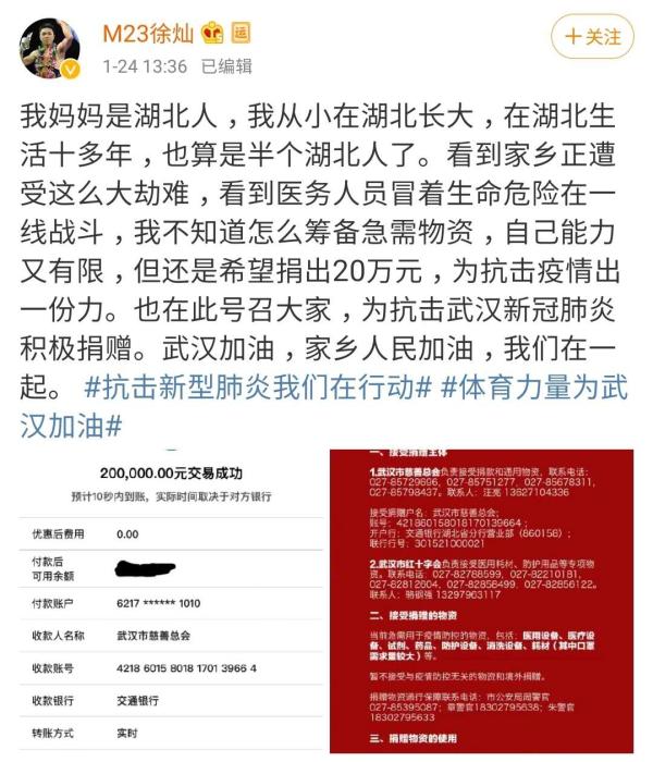 而目前,湖北正受到新型冠状病毒肺炎疫情的困扰,徐灿说“看到家乡正遭受这么大劫难,看到医务人员冒着生命危险在一线战斗,我不知道怎么筹备急需物资,自己能力又有限,但还是希望捐出20万元,为抗击疫情出一份力。也在此号召大家,为抗击武汉新冠肺炎积极捐赠。武汉加油,家乡人民加油,我们在一起。”
