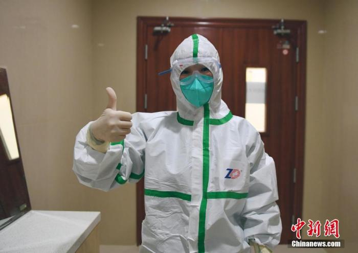 战役当前,所有人都在努力。图为医护人员穿好防护服自信地竖起大拇指。 李晨韵 摄